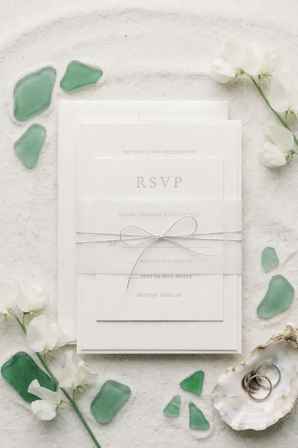 [Picture Prompt 3: The Ocean Mist Invitation Suite] Description: A styled flat lay photograph of a minimalist, luxury destination wedding invitation suite on a bed of fine white sand. 3:4 ratio. Key Elements: Elegant, pearl-white cardstock invitations with pale grey letterpress typography. The suite is wrapped in a translucent vellum band and a thin silver thread. Surrounding the paper goods are pieces of smooth, sea-glass green glass, a few delicate white sweet pea blooms, and a beautiful oyster shell holding the wedding rings. The lighting is soft, diffused, and calming.
