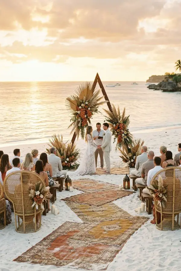 [Picture Prompt 2: The Sunbaked Sand Ceremony Setup] Description: A wide-angle, scenic photograph of a bohemian beach wedding ceremony at golden hour. 3:4 ratio. Key Elements: A triangular wooden ceremony arch standing on pristine white sand, heavily adorned with dried sun palms, fluffy pampas grass, and terracotta-colored orchids. The aisle is lined with vintage, distressed Persian rugs in shades of rust and mustard. The guest seating consists of natural rattan peacock chairs and wooden benches. The ocean is glowing in the background under a warm, sunbaked sky.