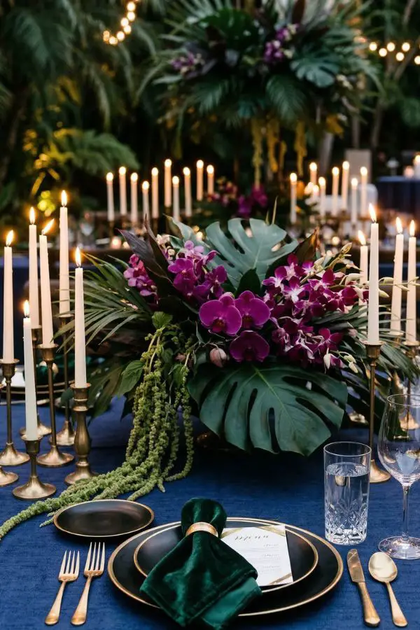 - How to Style It: Swap out standard white tablecloths for rich indigo velvet or dark navy linens. Centerpieces should lean heavily on structural, deep green tropical foliage—think massive monstera leaves, dark palm fronds, and black magic orchids. Bring the light back in with an abundance of brushed gold accents. Gold geometric lanterns, brass candlesticks, and gold-rimmed glassware will reflect the candlelight beautifully, making your reception space glow against the dark night sky.