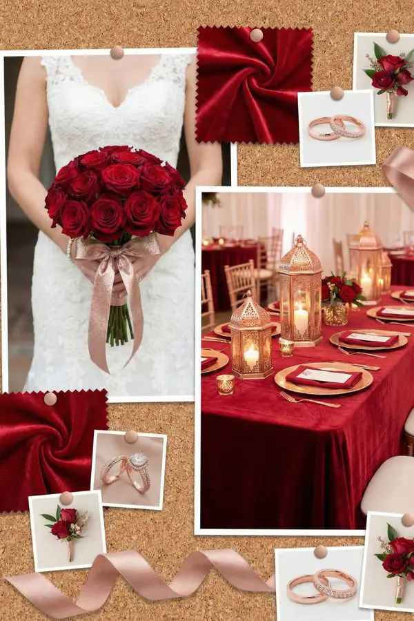 - Florals & Decor: Create a show-stopping bridal bouquet featuring vibrant red roses intertwined with rose-gold painted foliage, all wrapped up in a silky pink ribbon. For your reception, dress the tables in deep red linens and use rose gold geometric vases, lanterns, or candle holders to house your floral centerpieces.