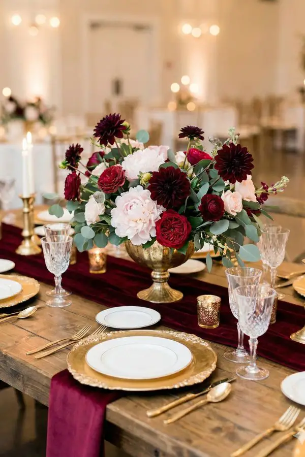 - Florals & Decor: Ask your florist for a dramatic, textured mix of dark wine dahlias, soft blush peonies, and classic white roses. On your reception tables, lay a wine-red table runner over a crisp white cloth. Elevate the look with gold charger plates, gold-rimmed glassware, and tall gold taper candles to create a warm, regal atmosphere.