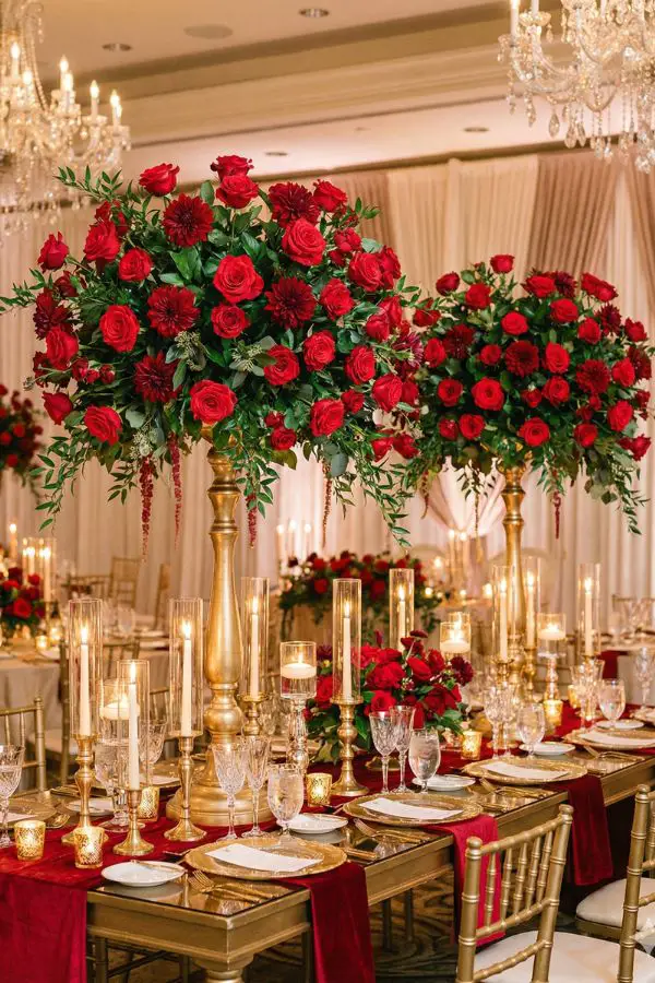 - Florals & Decor: Go all out with lush, all-red floral centerpieces—think classic red roses and tulips—elevated on ornate gold stands. Set the tables with gold napkins resting on white plates, all atop a rich red tablecloth.