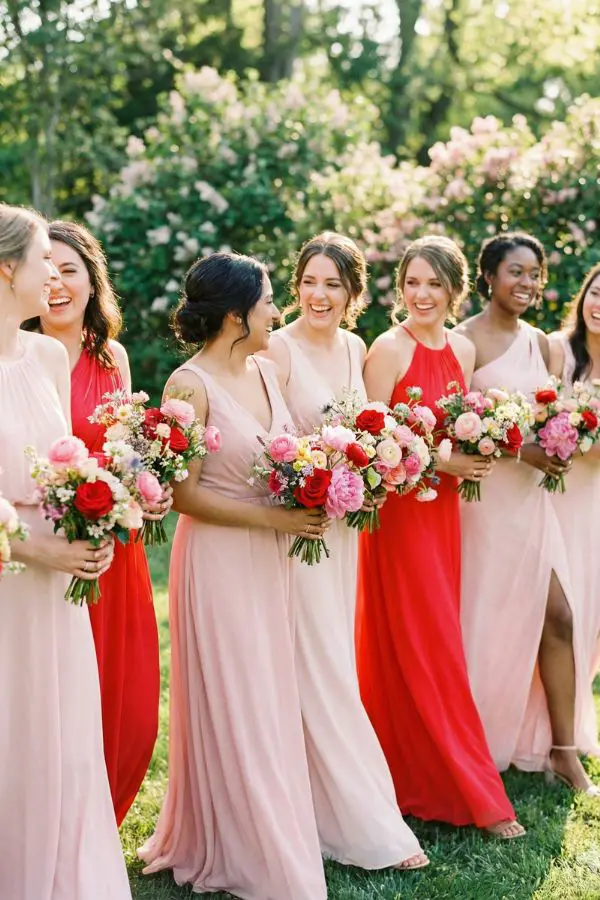 - Wedding Attire: Embrace the mismatched bridesmaid trend! Have half of your bridal party wear soft pink dresses and the other half wear vibrant red.