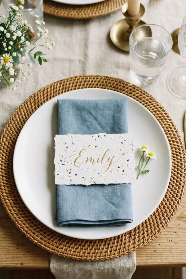 1. Plantable Wildflower Themed Placecards Add a personal and eco-friendly touch to your tablescape with plantable wildflower placecards. These are made from special seeded paper that guests can take home, plant in their gardens, and enjoy long after the celebration. It is a wonderful way to guide guests to their seats while providing a meaningful favor.
