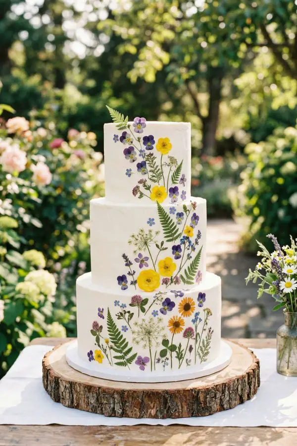 2. Floral Wedding Cake Topper Elevate your dessert display with a vibrant floral wedding cake topper. Instead of traditional fondant figures, opt for a custom wooden or acrylic sign featuring your names and wedding date, surrounded by pressed or edible wildflowers. It adds a touch of romance and personalized charm to even the simplest buttercream cake.