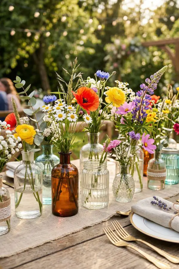Your floral arrangements are, of course, the stars of the show. Instead of tightly structured bouquets, opt for loose, organic shapes filled with daisies, vibrant poppies, delicate baby’s breath, and a mix of seasonal blooms.