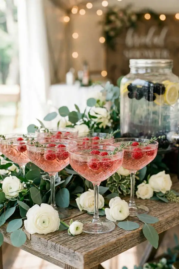 Welcome Drinks and Signature Cocktails Greet guests at the door with a signature drink. A “Berry in Love” Prosecco smash- featuring muddled raspberries, a splash of elderflower liqueur, and chilled Prosecco- is a crowd-pleaser. For a non-alcoholic option, serve a sparkling blackberry and thyme lemonade in beautiful glass pitchers with floating fruit garnishes.