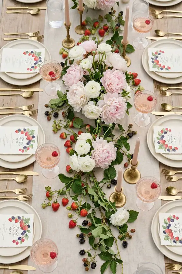 The Tablescape Start with a foundational layer, such as a soft blush or natural linen tablecloth. Down the center of the table, create a lush, low runner. Instead of relying solely on flowers, integrate fresh produce! Weave wooden pint baskets overflowing with fresh, glossy strawberries, dark blackberries, and bright raspberries directly into the floral arrangements.