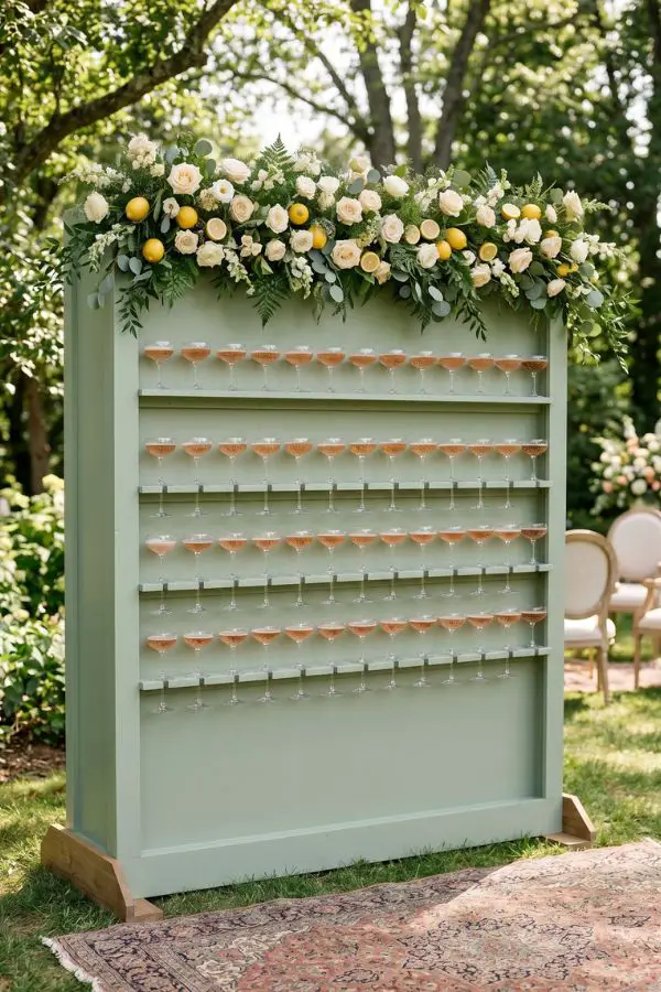 The Champagne Wall Nothing says “celebration” quite like a wall of champagne. You can rent or build a wooden wall with built-in shelves specifically designed to hold crystal champagne flutes or coupe glasses. Embellish the top with a floral garland. Guests can grab their welcome drink right from the wall, and once they do, the wall remains a gorgeous, sophisticated backdrop for photos.