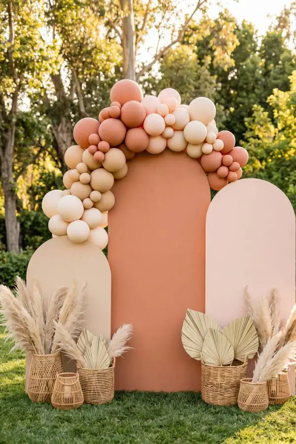 Painted Wooden Panels Custom wooden backdrop panels (often called “Chiara walls”) are wildly popular. These are freestanding wooden cutouts, usually arched or half-arched, painted in the event’s color palette. Grouping two or three panels of varying heights creates a chic, layered look. You can paint them in earthy terracotta, soft sage, or muted mustard. To soften the solid wood, drape a balloon garland over one side or place dramatic, modern floral arrangements at the base.