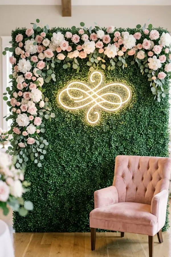 Greenery and Neon If a full flower wall feels too traditional, opt for a boxwood greenery wall. This serves as a fantastic, rich, and textural canvas. To modernize the look, hang a custom LED neon sign right in the center. Phrases like “Better Together,” “Drunk in Love,” or the bride’s future last name add a fun, personalized glow. Frame the edges of the greenery wall with a half-arch of fresh or faux flowers in the shower’s color palette.