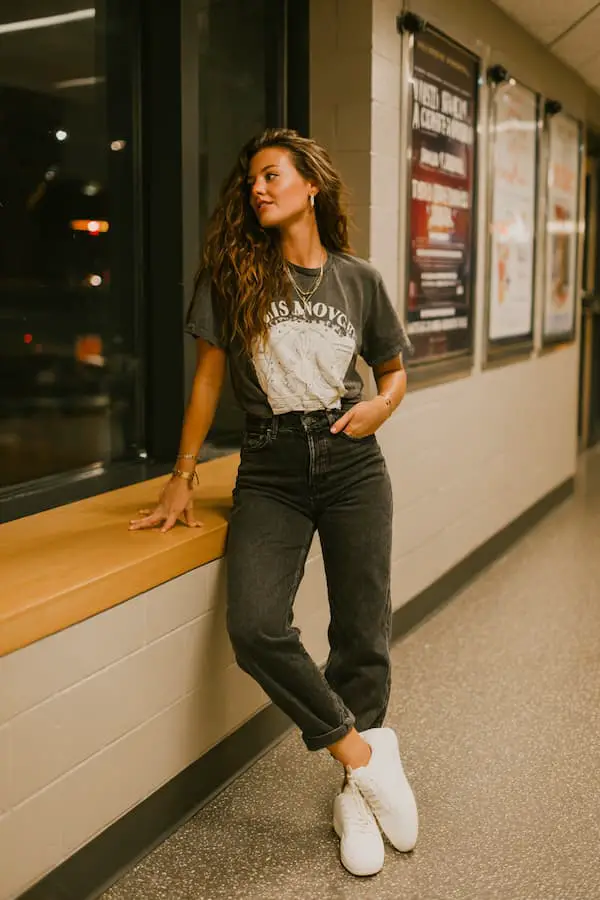 A perfectly fitted pair of dark wash jeans with a soft, slightly oversized vintage band tee tucked in at the front. Add white sneakers and delicate gold jewelry for that “I woke up like this” vibe that definitely didn’t take an hour to perfect.