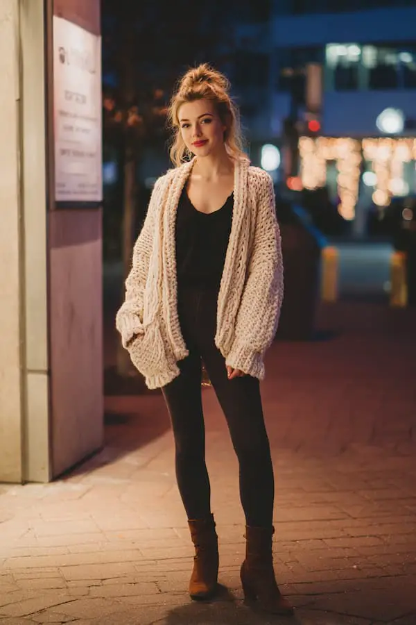 A chunky knit cardigan in cream or camel over a fitted black tank, paired with high-waisted leggings and ankle boots. This is comfort dressing that photographs beautifully and transitions from theater to late-night diner seamlessly.