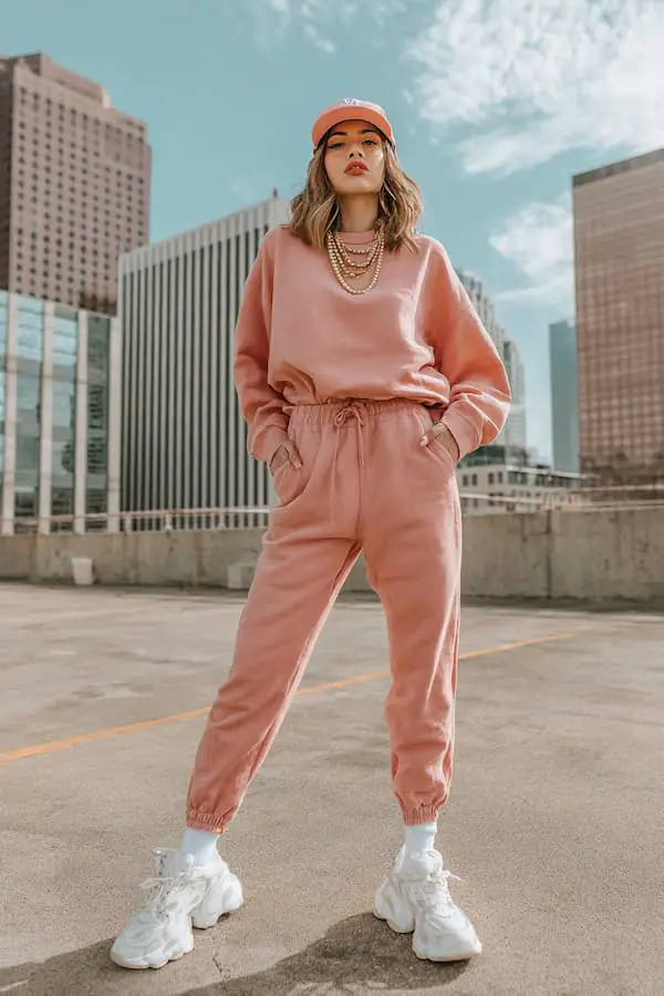 High-waisted matching sweat set in a pretty color like dusty rose or sage green, paired with chunky white sneakers and a baseball cap. Comfort meets style in the most Instagram-worthy way possible.