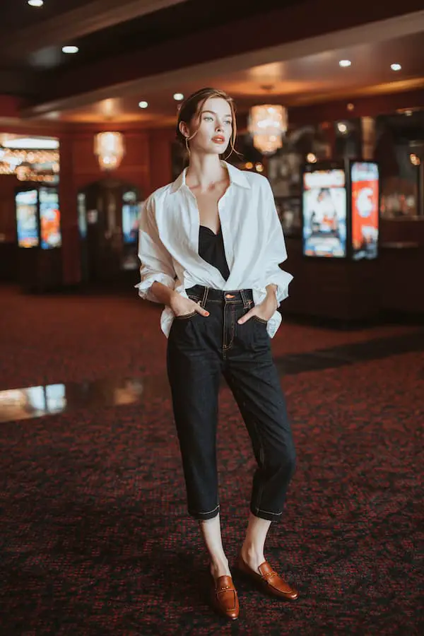 An oversized white button-up shirt worn open over a fitted black cami, with straight-leg jeans and loafers. It’s preppy without being precious, and those sleeves can roll up when the popcorn situation gets serious.