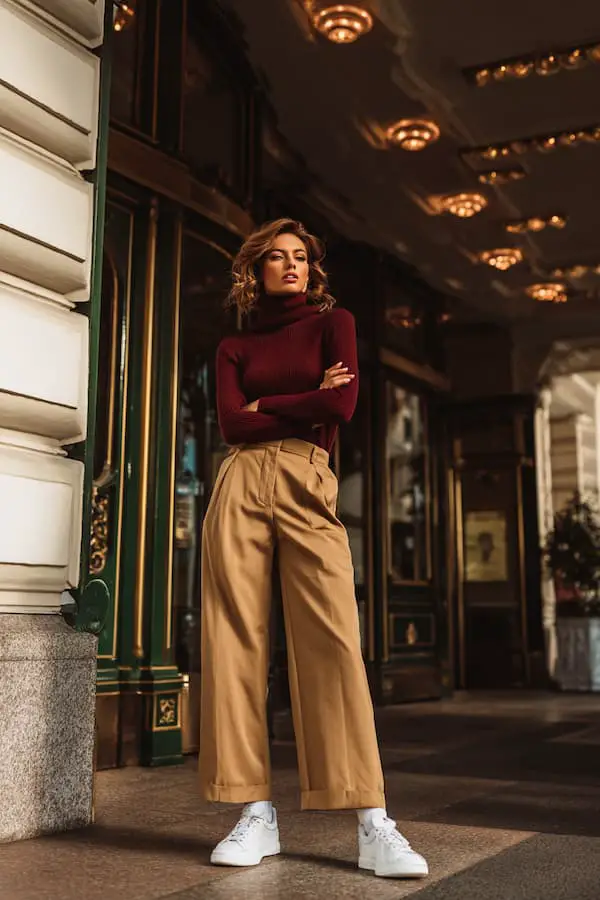 A fitted turtleneck in burgundy or forest green with wide-leg trousers and white sneakers. This combo is cozy enough for a three-hour epic but polished enough for dinner after.