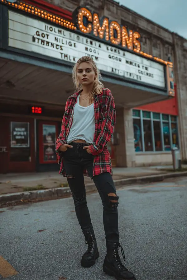 A flannel shirt in classic red and black plaid over a white tank, with black skinny jeans and combat boots. It’s giving “cool girl who knows good movies” energy.