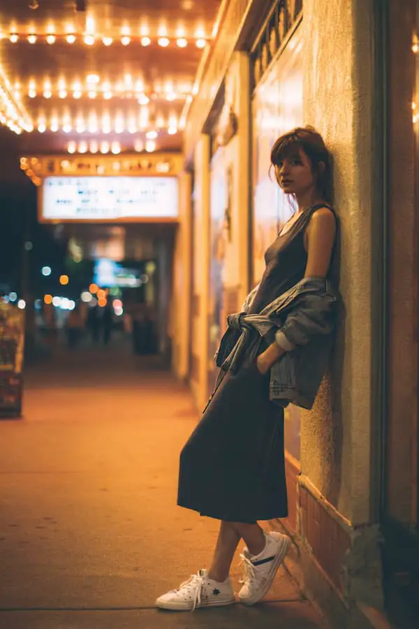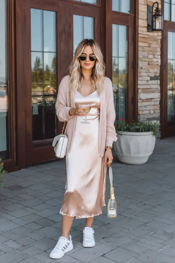 A midi slip dress in champagne or blush pink with a cropped cardigan and white sneakers. It’s unexpectedly perfect for movie dates—feminine but not fussy, comfortable but still special.