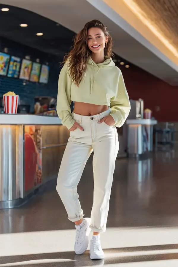 A fitted cropped hoodie in a soft color like lavender or sage with high-waisted jeans and clean white sneakers. It’s comfortable enough for a movie marathon but cute enough for the obligatory lobby selfie.