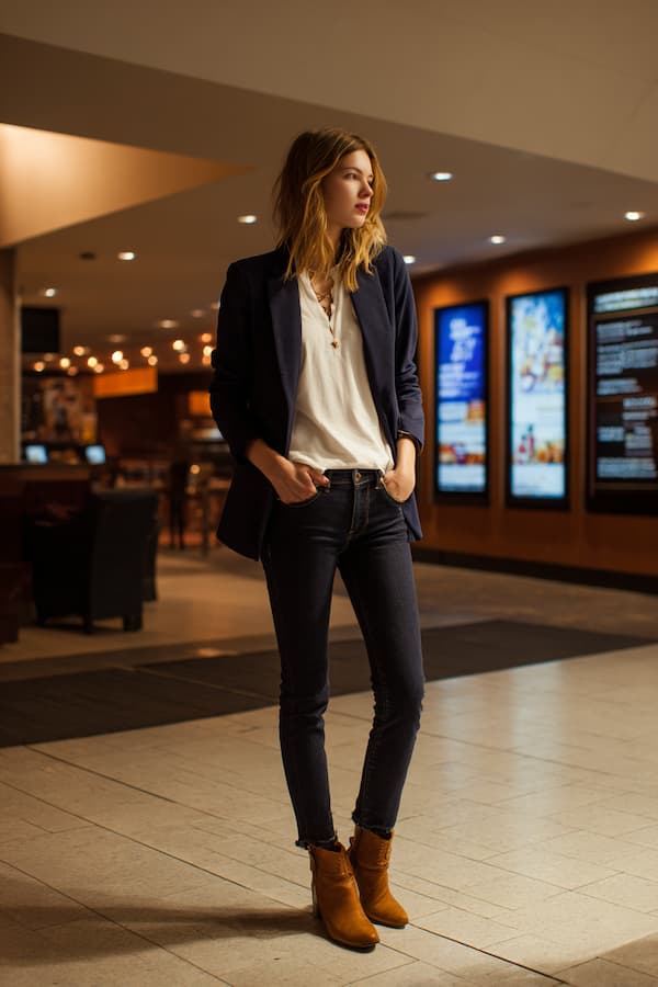 A relaxed blazer in navy or camel over a fitted white tee, with straight-leg jeans and ankle boots. This look says “I have my life together” even if you definitely don’t know what you’re doing half the time.