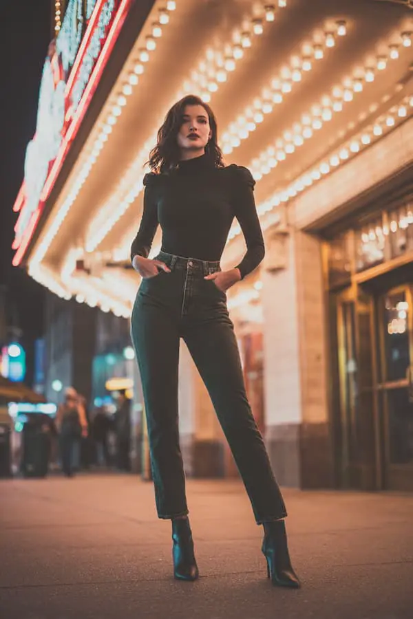A long-sleeved bodysuit in black or deep green with high-waisted jeans and heeled ankle boots. It’s sleek without being overdressed, and there’s zero risk of shirt riding up during dramatic popcorn reaches.