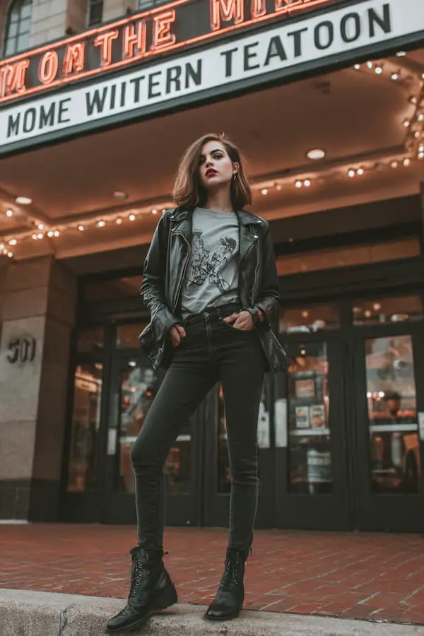 A classic black leather jacket over a fitted grey tee with black jeans and ankle boots. It’s effortlessly cool and gives you that “mysterious movie protagonist” vibe.