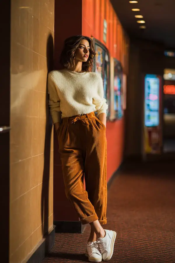 High-waisted corduroy pants in rust or olive green with a cream sweater and white sneakers. This texture combination is having a moment, and it photographs beautifully while being incredibly comfortable.
