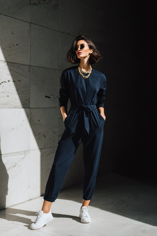 A casual jumpsuit in navy or black with sneakers and a statement necklace. It’s one piece that looks like you put thought into your outfit while being as comfortable as pajamas.