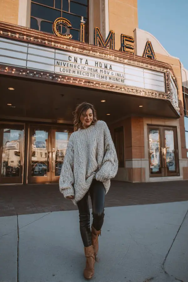 A chunky oversized sweater in cream or grey with fitted black leggings and tall boots. It’s the perfect “let’s get cozy and watch movies” energy while still looking intentional and cute.