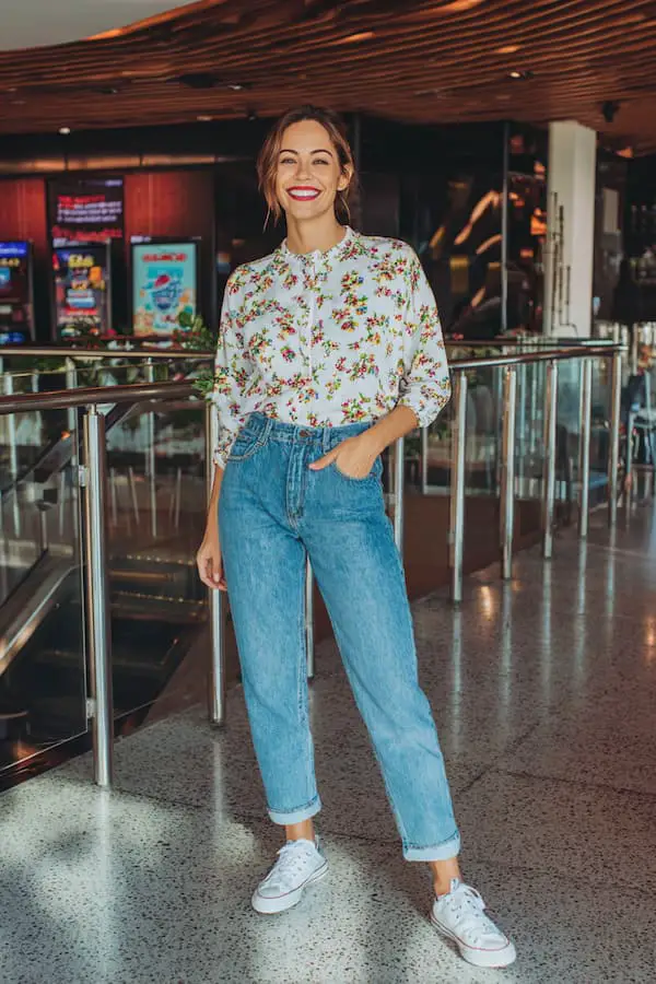 A fun printed blouse or tee with solid-colored jeans and canvas sneakers. Let the top be the star while keeping everything else simple and comfortable.