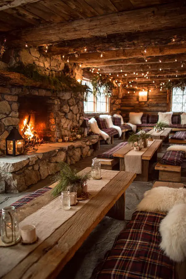 Decor Elements: Plaid patterns, faux fur throws, wooden accents
