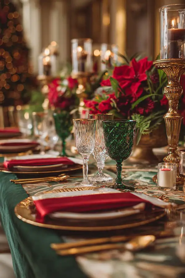 Decor Elements: Poinsettias, pine branches, ornaments
