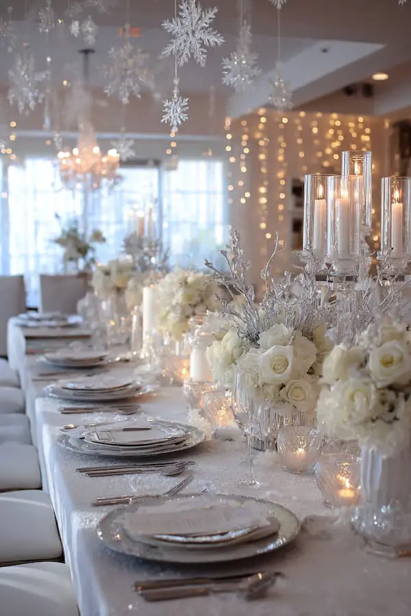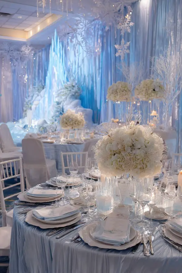 There’s something incredibly enchanting about a winter wonderland. Picture it: frosty trees, twinkling fairy lights, and a touch of ice and snow. This theme is all about creating a serene and magical atmosphere that makes guests feel like they’ve stepped into a snow globe.
