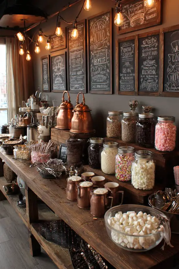 Example: A rustic wooden table set with mason jars filled with toppings and vintage mugs will make guests feel like they’re sipping cocoa by the fire. Add some twinkle lights for extra coziness.