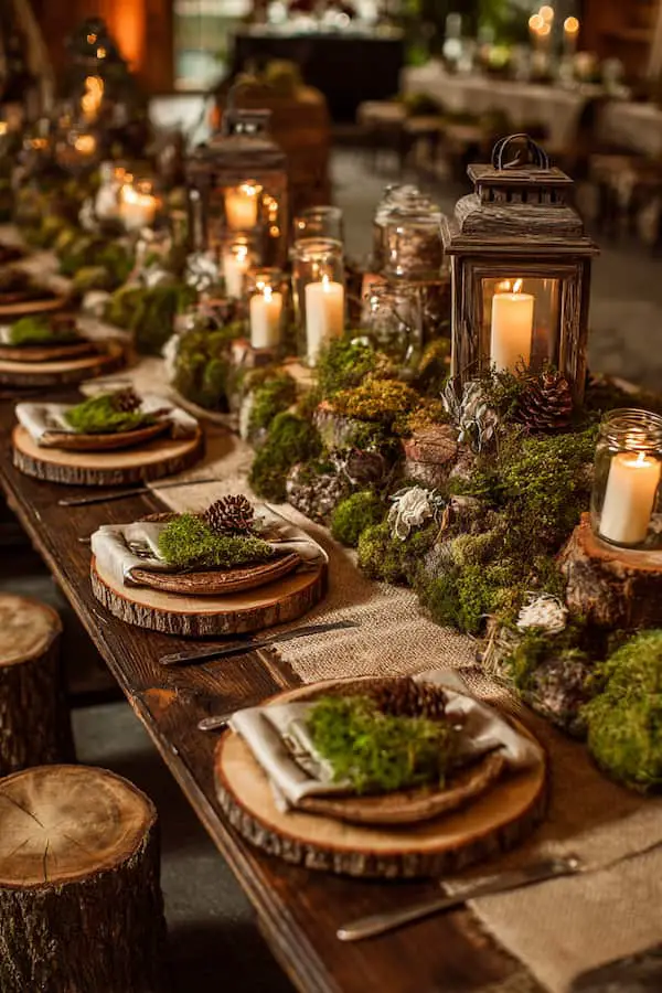 Example: Tables dressed with burlap runners and centerpieces featuring moss, pinecones, and candles set a perfect woodland scene.