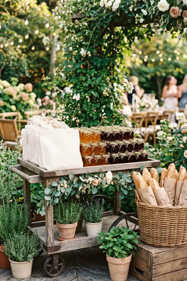 Pre-Packaged Farm Favors If an interactive station isn’t in your budget, you can still send guests home with market-inspired gifts beautifully displayed on a wooden cart: