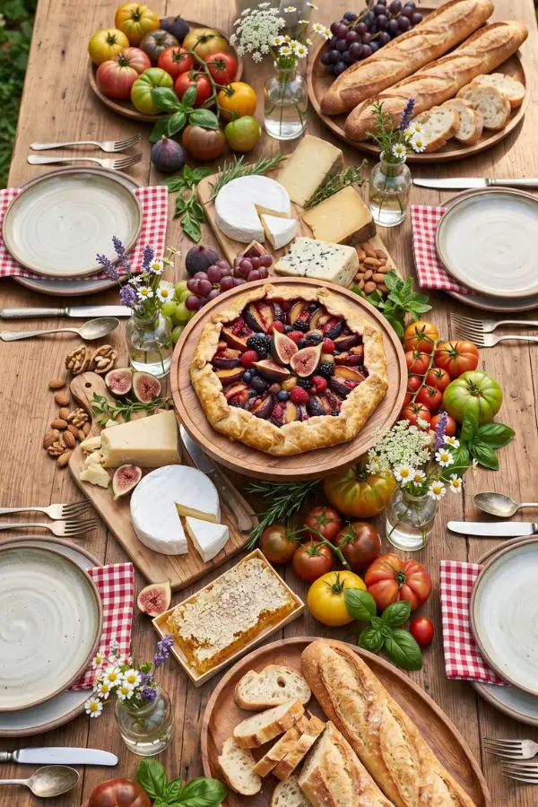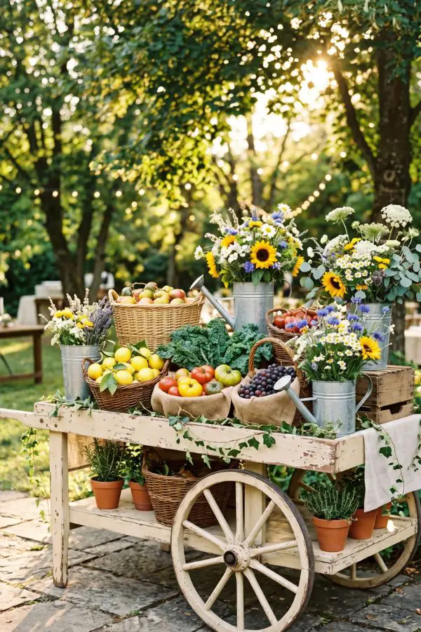 The Ultimate Grazing Station Set up a massive wooden table as your central “Farm Stand.” Cover it in butcher paper and build an epic charcuterie and crudité spread. Feature local artisanal cheeses, crusty sliced baguettes, honeycomb, fresh figs, grapes, and a rainbow of raw vegetables with homemade dips like roasted red pepper hummus and herbed tzatziki.
