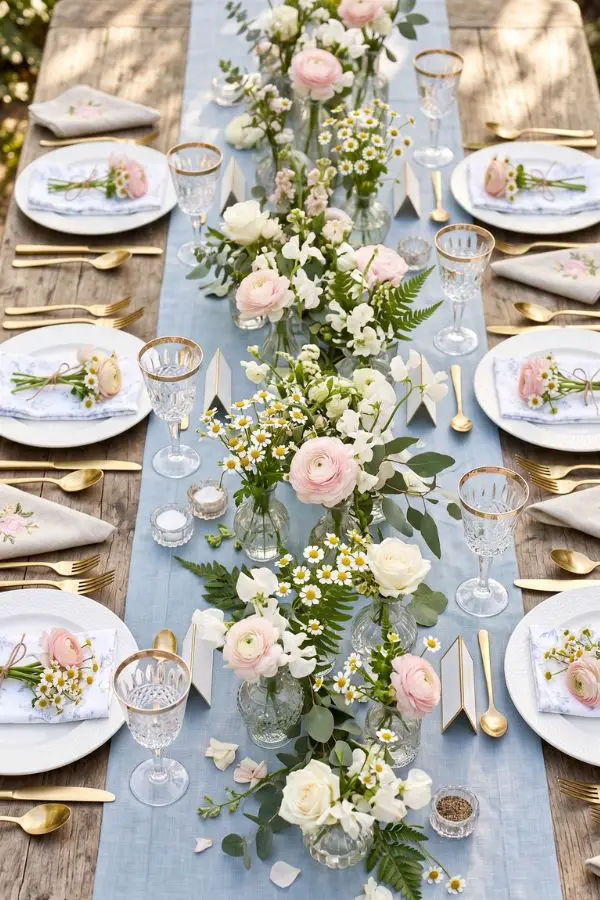 The Tablescape Instead of one massive, obstructing centerpiece, opt for an organic, sprawling look. Use a soft, sheer table runner in a pastel hue and line the center of the table with multiple small glass bud vases. Fill these vases with single stems of varying heights—ranunculus, tulips, and chamomile daisies work beautifully. This “growing garden” approach is incredibly trendy and encourages conversation across the table.