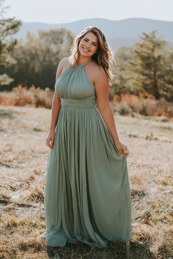 A sage green maxi dress with a halter neckline and Grecian-inspired draping. The flowing silhouette moves beautifully and the halter top provides excellent support.