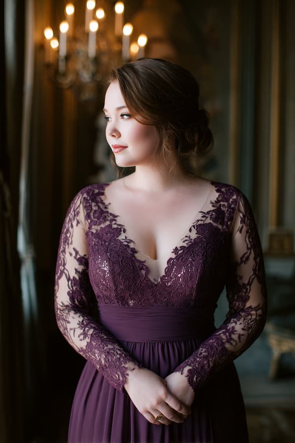 A deep plum dress with delicate lace sleeves and a chiffon skirt. The lace adds texture and sophistication while the flowing bottom half creates a stunning silhouette.