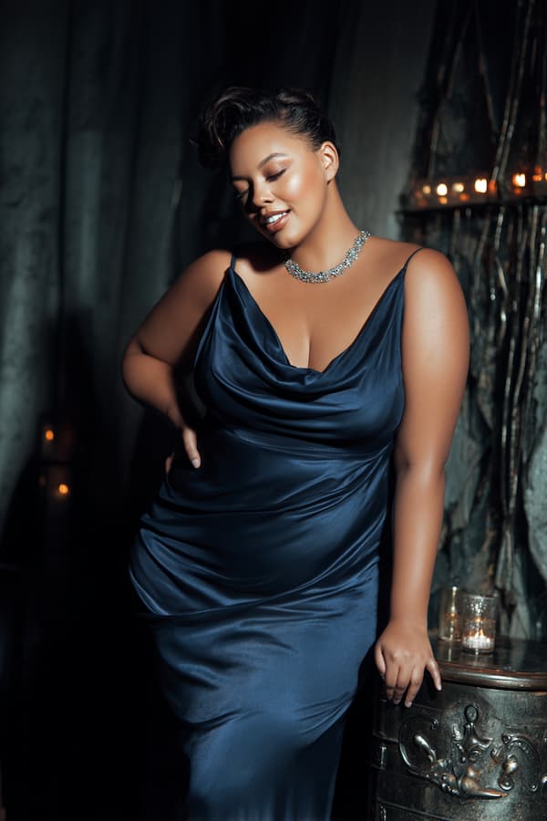 A midnight blue dress featuring a draped cowl neckline and a sleek column silhouette. The liquid-like fabric creates beautiful movement and the deep neckline is unexpectedly flattering.