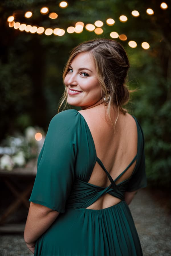 A forest green dress with a modest front and a stunning open back detail. The unexpected back interest keeps the look modern while the front remains classic and elegant.