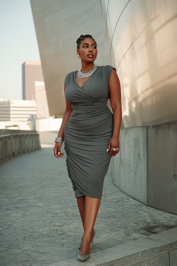 A charcoal gray sheath dress with subtle ruching at the waist and a knee-length hem. The streamlined silhouette is modern and chic without sacrificing comfort.