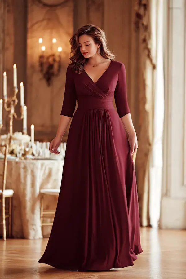 A wine-colored dress with a flattering V-neckline and three-quarter sleeves. The structured bodice smooths and supports while the flowing skirt creates an hourglass silhouette.