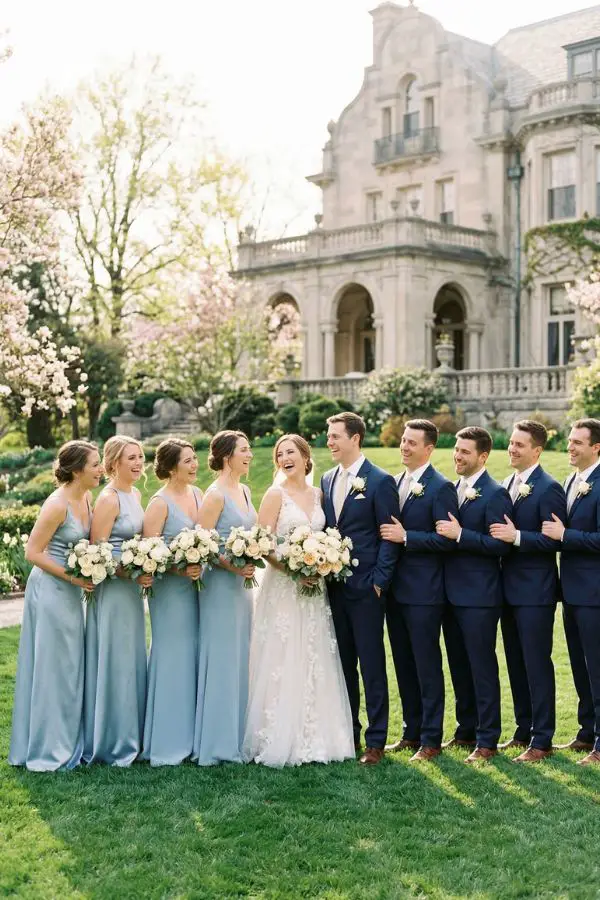 - The Wardrobe: Powder blue satin dresses for the bridesmaids will look stunning in photos, catching the spring sunlight beautifully. For the groom, a sharp navy blue suit offers a perfect, classic contrast to the light, airy colors of the rest of the wedding party.