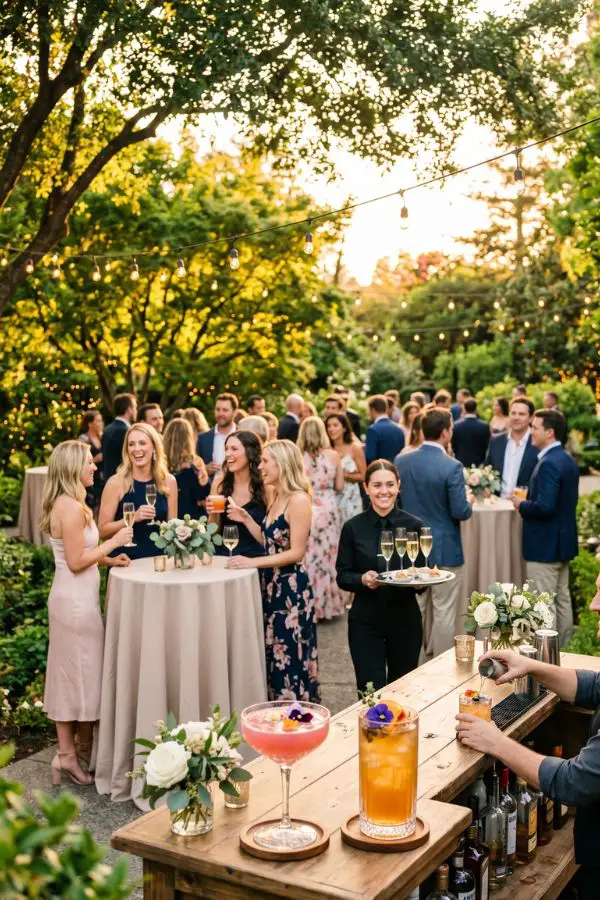5:30 PM – Cocktail Hour and Sunset Photos While your guests transition to the patio or lounge area for signature drinks and passed hors d’oeuvres, you and your new spouse will sneak away with your photographer. Depending on the time of year, this 5:30 PM to 6:30 PM window often aligns perfectly with “Golden Hour.” You will spend 15 minutes capturing those dreamy, sun-drenched sunset photos, and then you can join the second half of your cocktail hour to mingle with your guests!