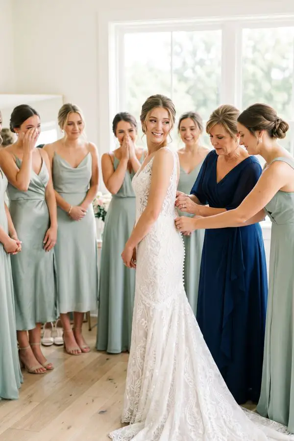 2:15 PM – The Bride Gets Dressed It is time! Have your mother or maid of honor help you into your dress. Factor in 15 to 30 minutes for this, especially if your gown has an intricate corset, endless buttons, or you are adding a dramatic veil.